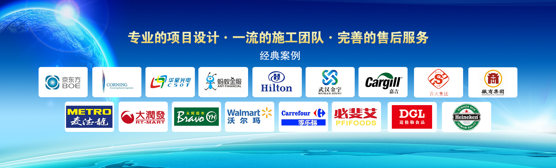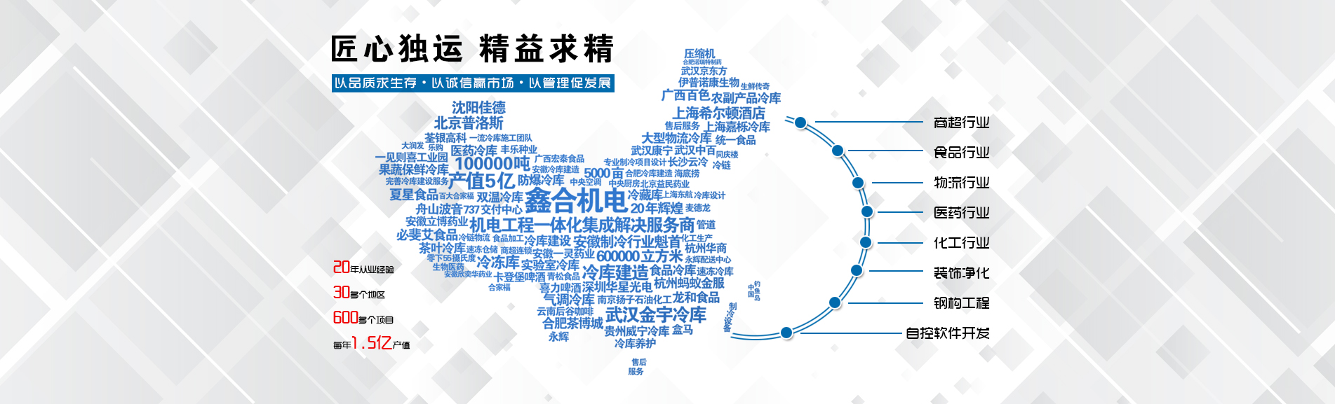 冷凍冷藏設(shè)備大型冷庫項目:   武漢中百物流冷庫(40000㎡)、蘇州、北京普洛斯大型物流庫(17000㎡)、沈陽佳德物流冷庫(20000㎡)、上海東航配餐物流庫(6000㎡)、杭州華商勾莊物流冷庫(24000㎡)、安徽安心蔬菜綠色食品冷庫(12000㎡)、武漢金宇冷庫(35000㎡)、必斐艾食品廠(14000㎡)、中國-東盟(百色)農(nóng)產(chǎn)品交易中心冷庫物流工程(30000㎡)、遵鐵物流冷鏈物流區(qū)建設(shè)項目中心冷庫物流工程(16500㎡)、長沙云冷產(chǎn)業(yè)園冷庫物流工程(21000㎡)等;大型中央空調(diào)項目:   武漢康寧顯示玻璃廠廠房、武漢京東方模組廠房、武漢華星光電模組廠房、深圳華星光電模組廠房,杭州阿里巴巴辦公樓,舟山波音737機(jī)場辦公樓,南京江北能源站、上海金融大酒店等